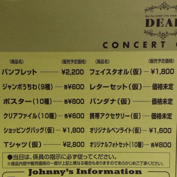 JUMP LIVE 1617 DEAR」のコンサートグッズが明らかになりました。 まだ価格未定のものもありますが、ボディーシールやキャラクターキーホルダーなど、デザインが楽しみなグッズが発表されています。1750円 dear・・最新コンサート会場販売 tour hey!既にツアーファイナルとなるライブツアー 「hey!say!jump live tour 16 dear」 この 名古屋公演のプレも含めた グッズ販売詳細が公表されています では早速、ご紹介したいと思います 公演日程はコチラ♪ グッズ詳細はコチラ♪ 現在までの公演レポはコチラからご
